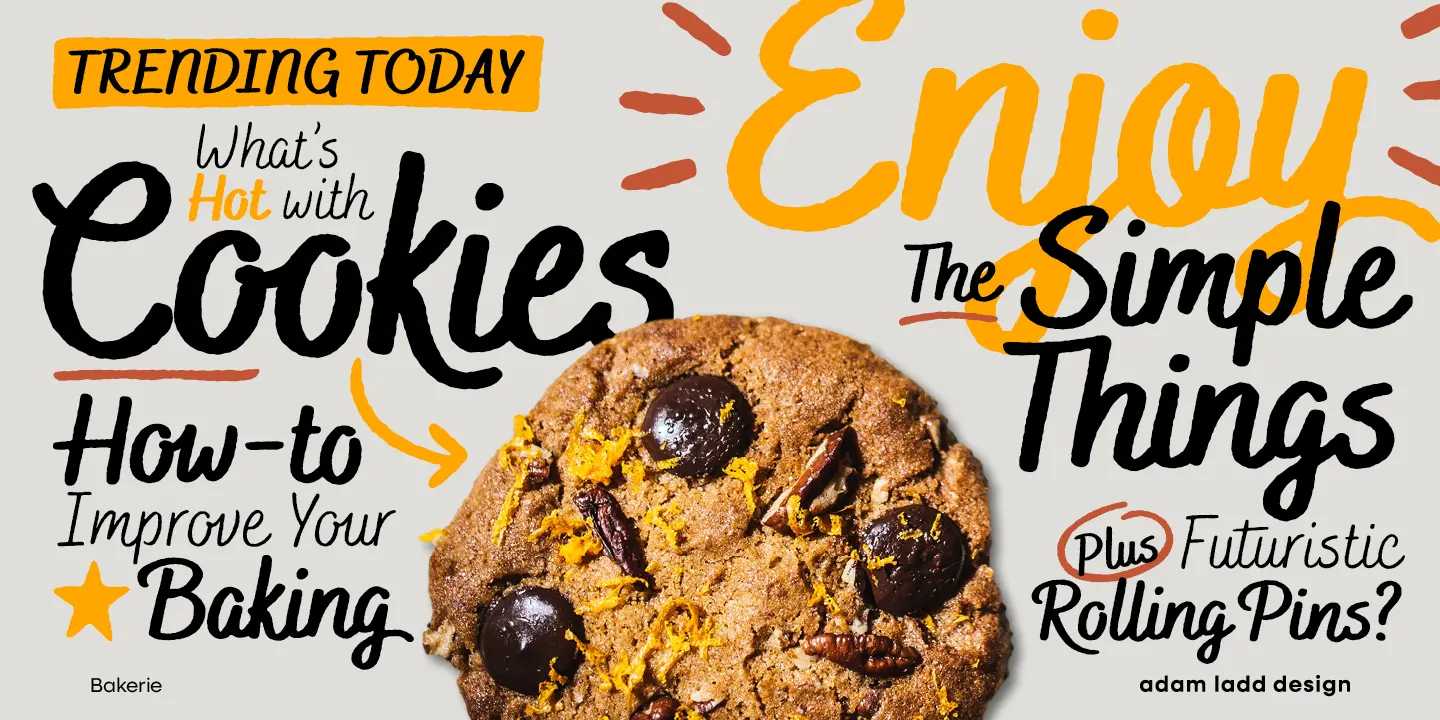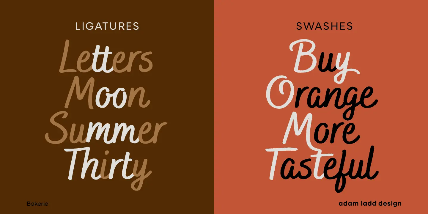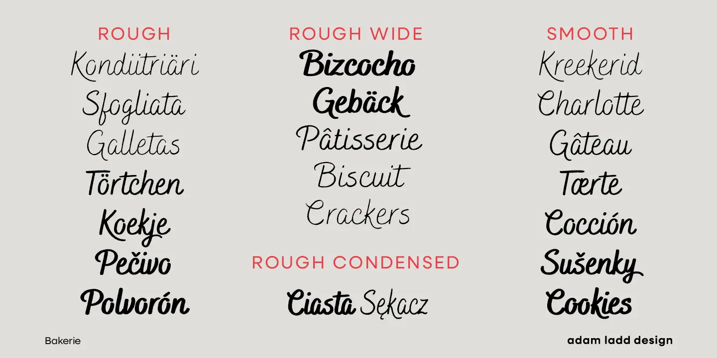 Bakerie is an authentically handwritten script family created by brush pen on paper, designed to be readable, even in smaller sizes. From thin and delicate to heavy and playful, the stylistic alternates, standard and discretionary ligatures, and swashes offer the flexibility to customize your typography to get an even more authentic, handwritten look. With 42 fonts consisting of 7 weights and 3 widths, with rough and smooth options, and bonus ornament glyphs, Bakerie will enhance your design.