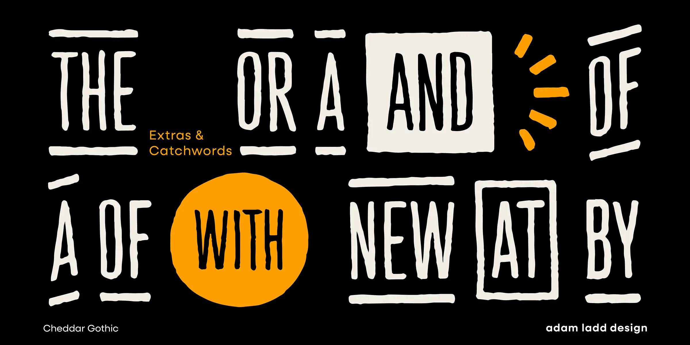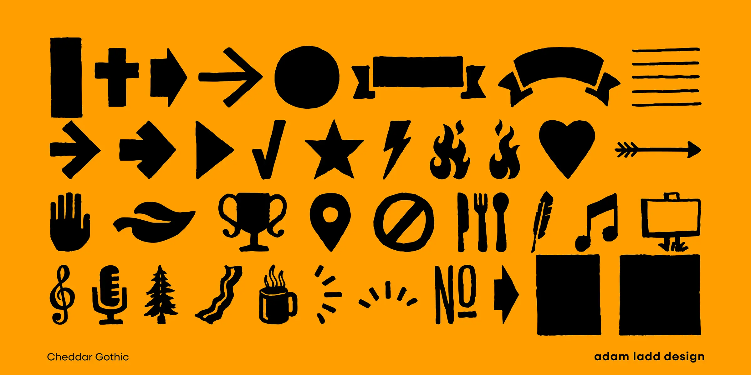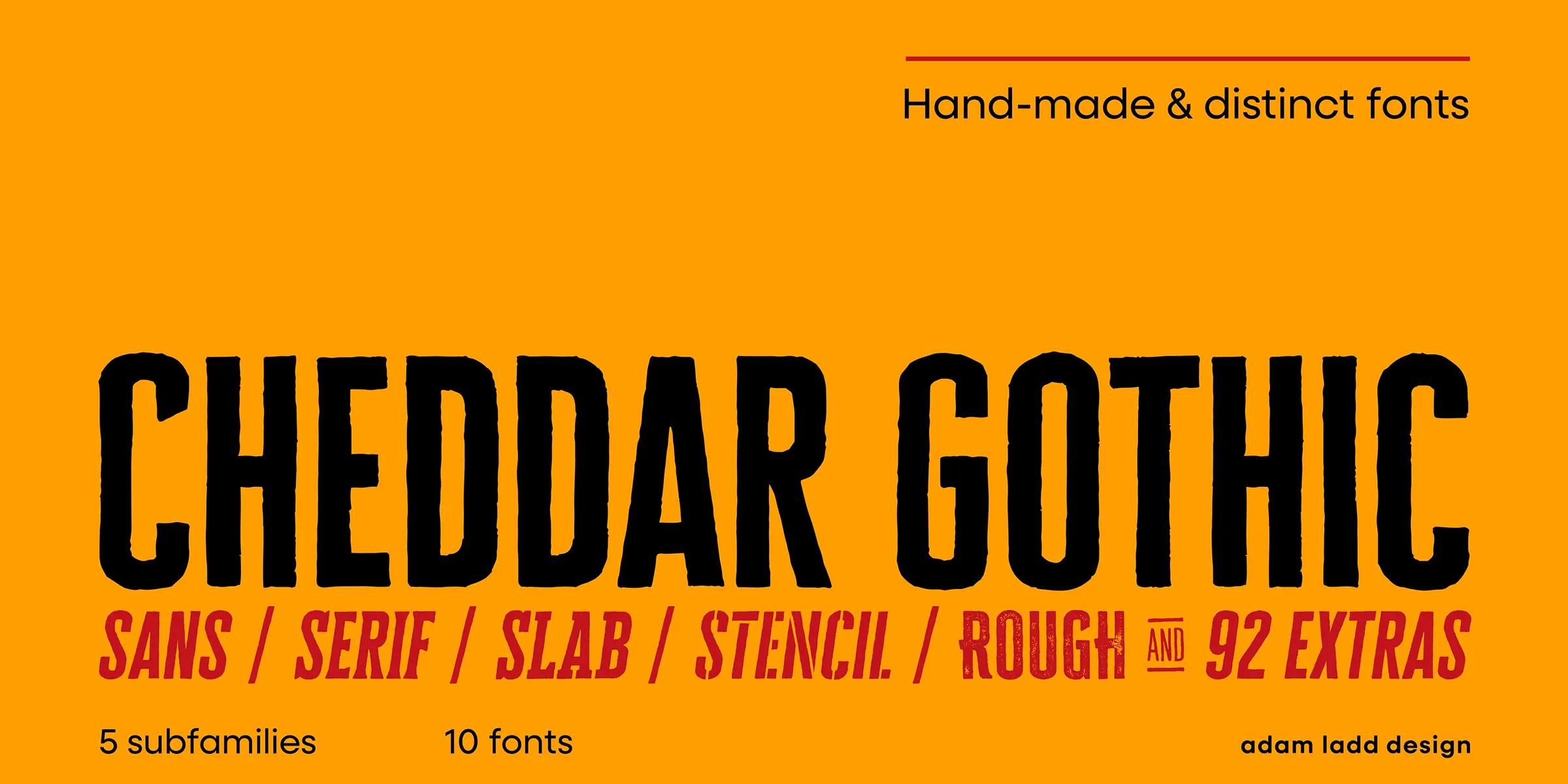 Cheddar Gothic is a deliberately rough-hewn sans typeface. Each style in the family is rugged, readable, and thoughtfully hand-drawn. They all stand tenaciously tall and are well-suited for communicating diverse ideas, including wanderlust travel, urban campaigns, artisanal food packaging, concert posters, gaming merchandise, social media brands, and magazine headlines! This all-caps family includes Sans, Serif, Slab, and Stencil, with Italics, as well as 92 matching catchwords and icons.