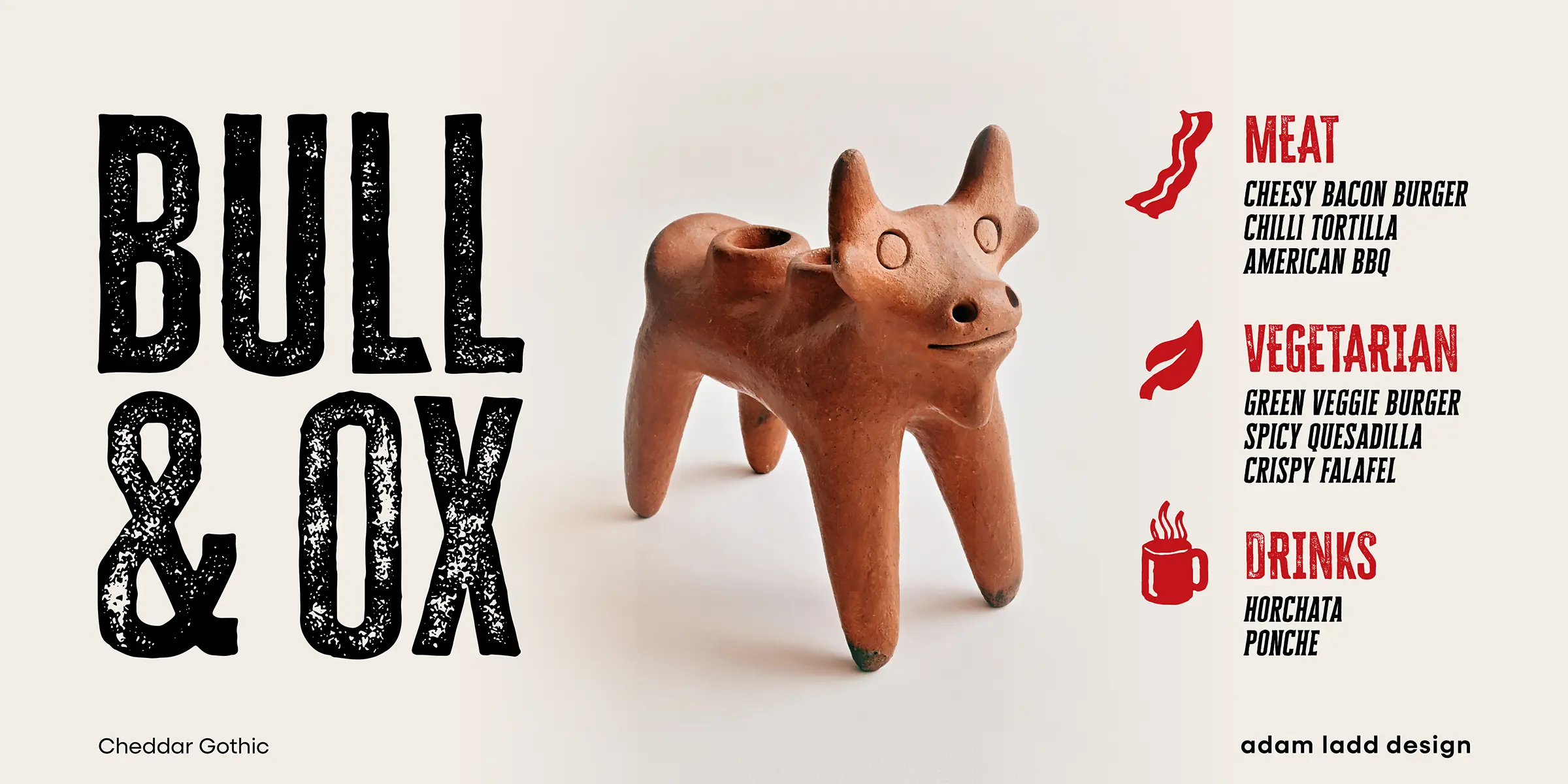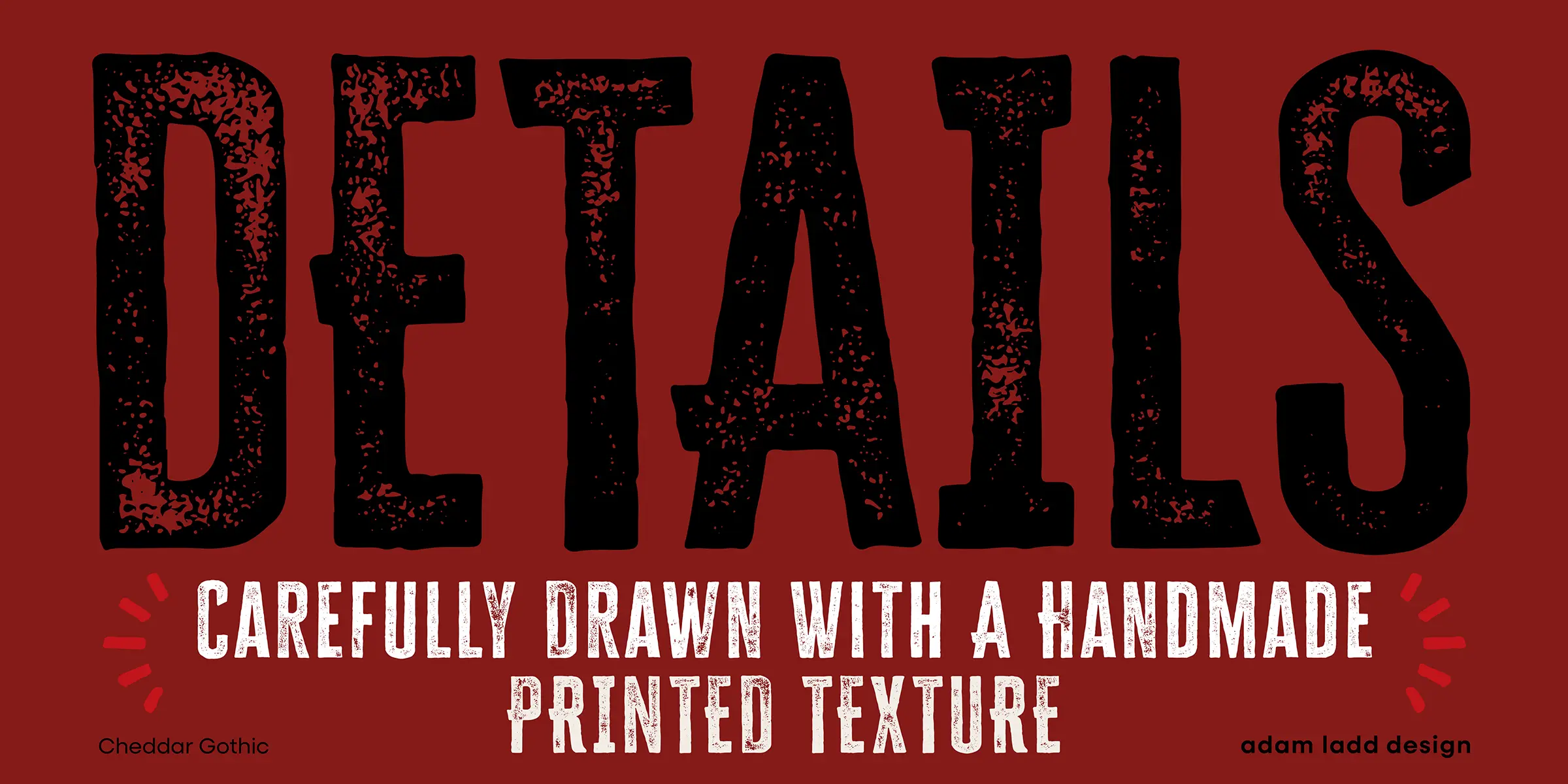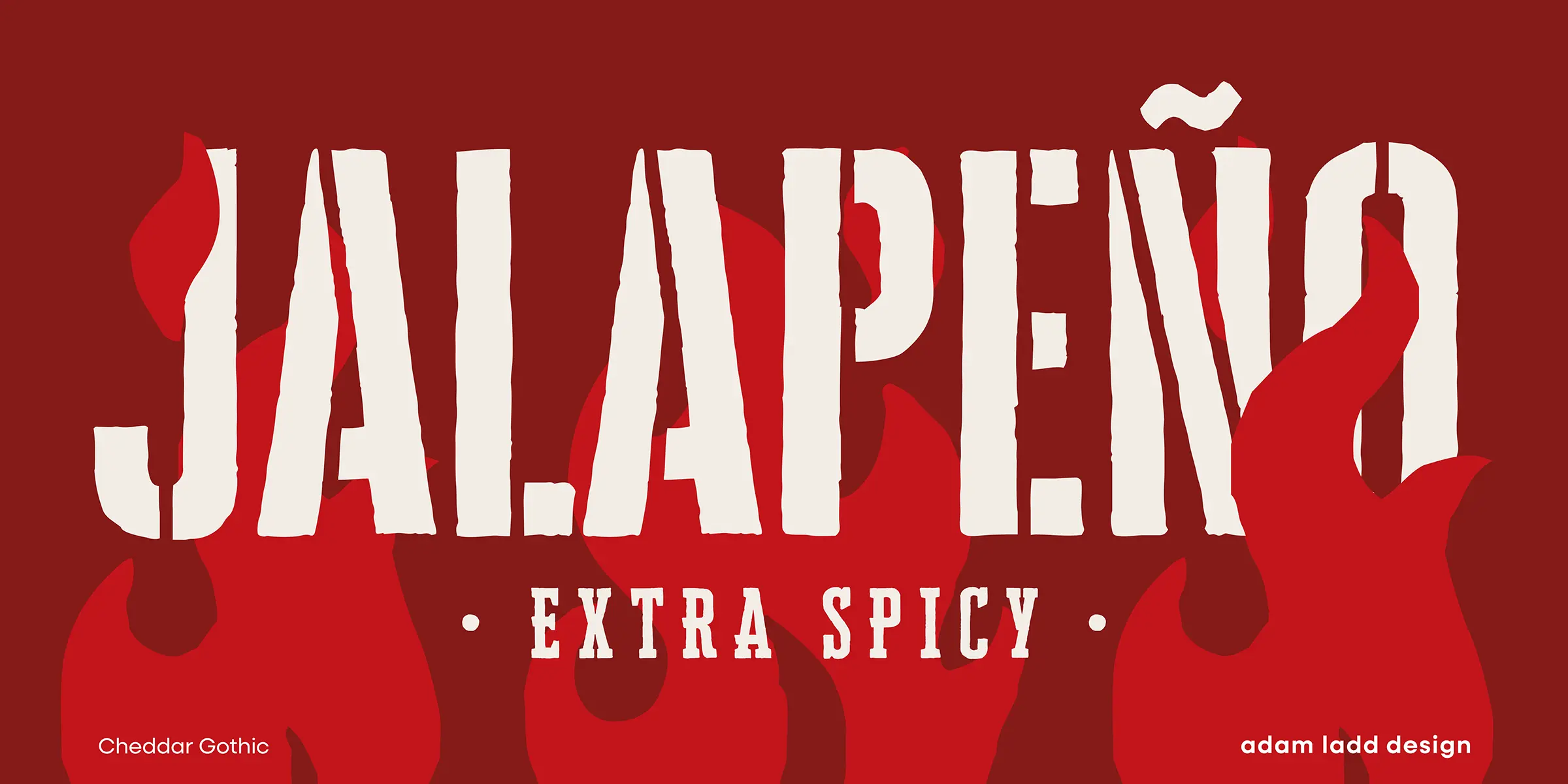 Cheddar Gothic is a deliberately rough-hewn sans typeface. Each style in the family is rugged, readable, and thoughtfully hand-drawn. They all stand tenaciously tall and are well-suited for communicating diverse ideas, including wanderlust travel, urban campaigns, artisanal food packaging, concert posters, gaming merchandise, social media brands, and magazine headlines! This all-caps family includes Sans, Serif, Slab, and Stencil, with Italics, as well as 92 matching catchwords and icons.