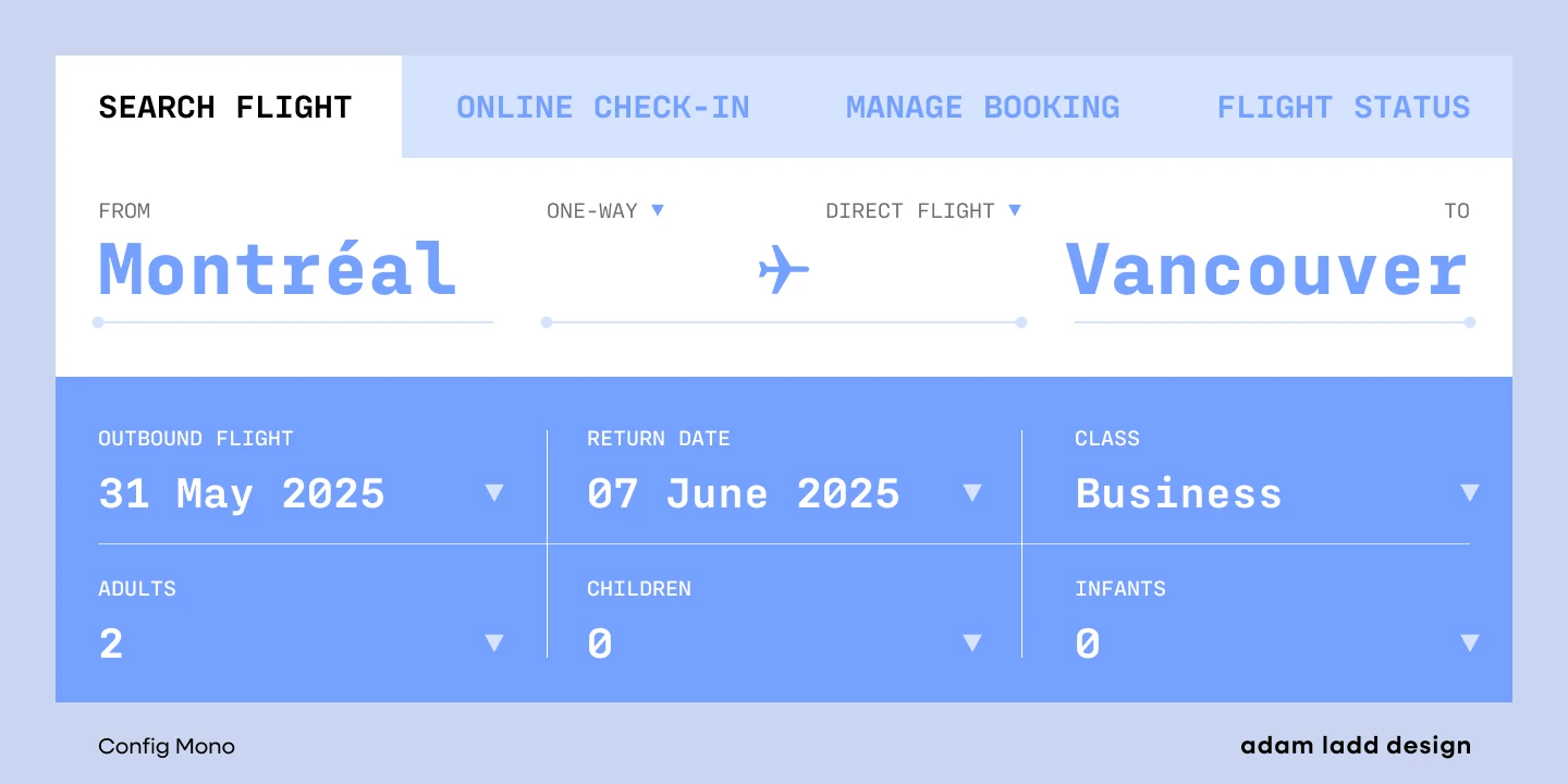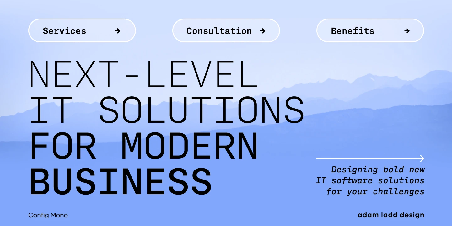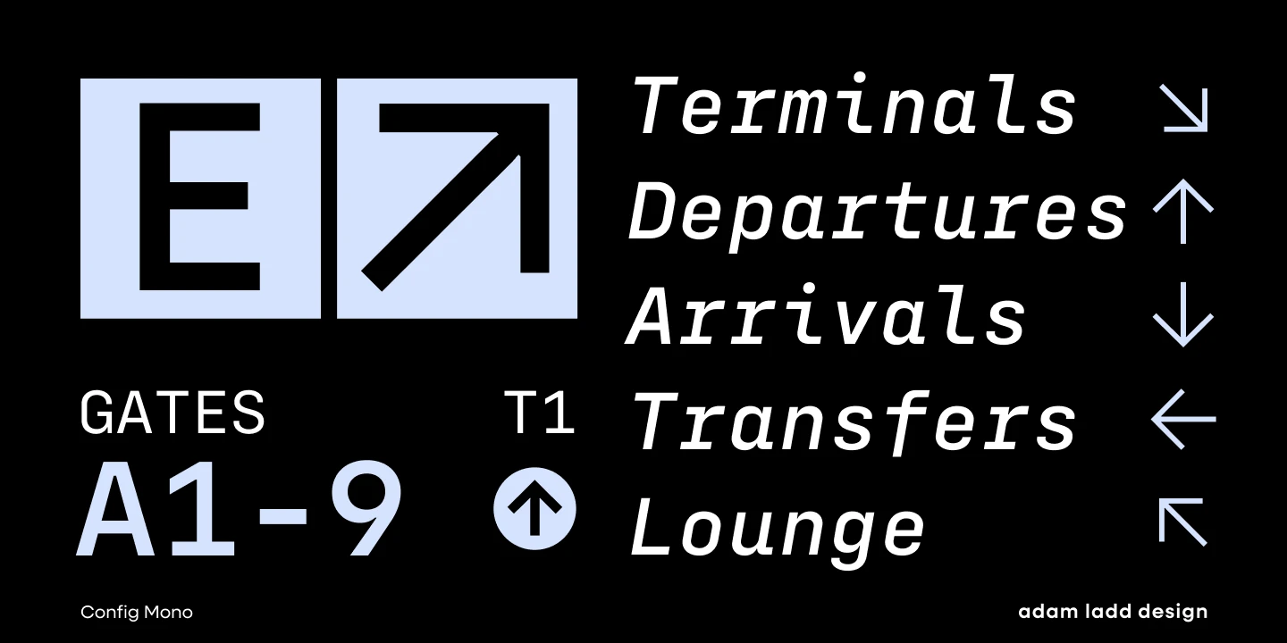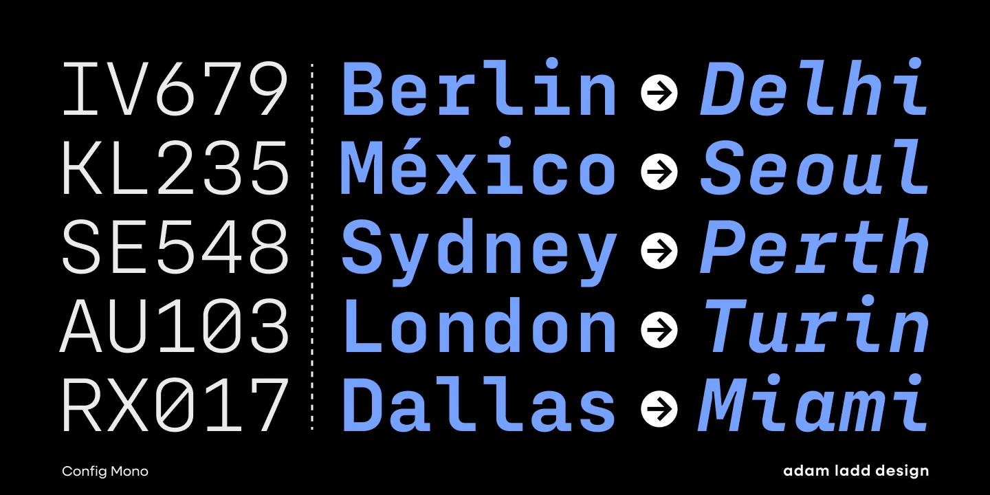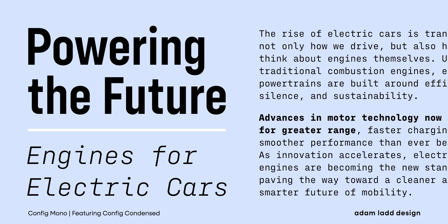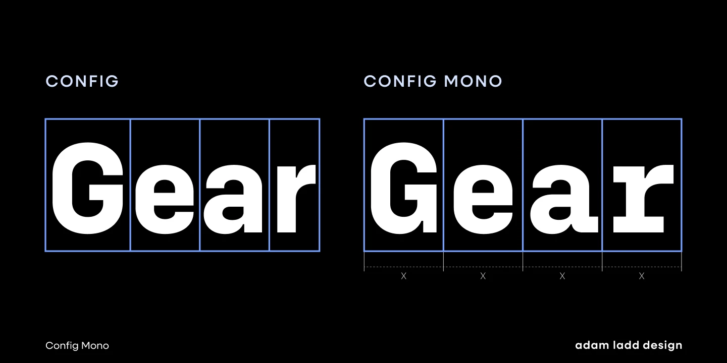 Config Mono is a monospace sans serif, adapting the modern technical spirit of the Config font family into a fixed-width format. Modified for clarity and utility, it introduces subtle refinements in the roman and italic, enhancing readability across digital and print environments. Stylistic alternates give added flexibility, while the design remains clean and versatile — well-suited for smaller sizes in UI, coding, game consoles, and captions, and for larger sizes in magazines, textbooks, and packaging.