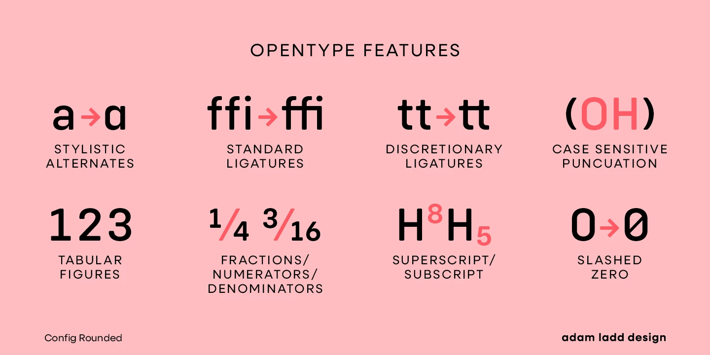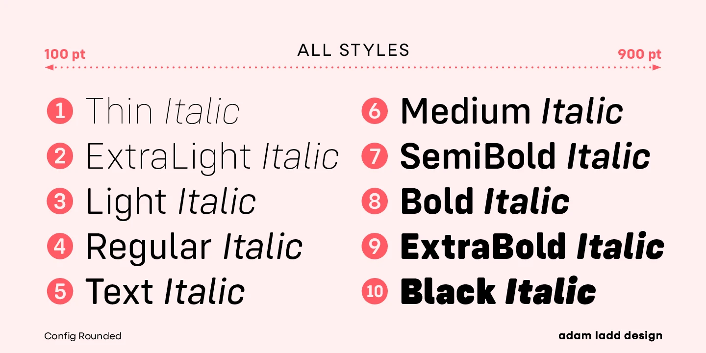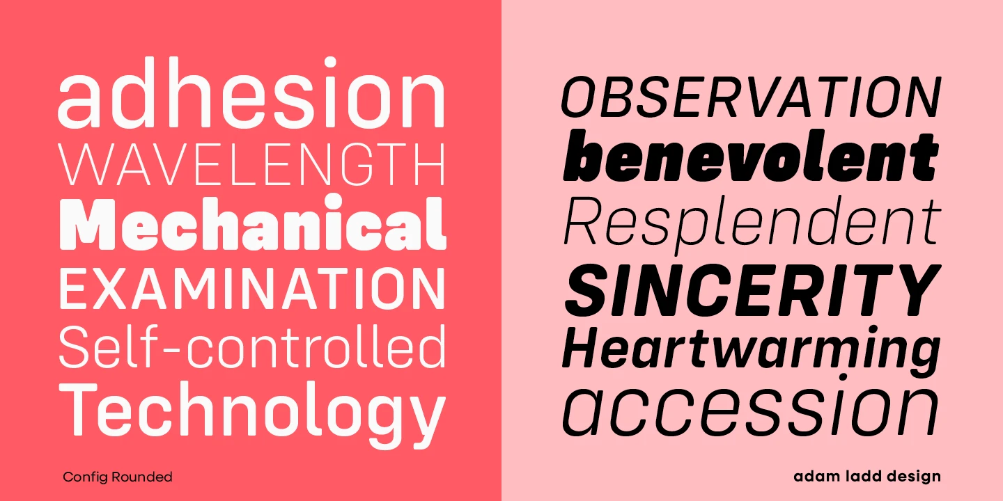 Config Rounded is a soft geometric sans family in the style of other industrial typefaces. With circular forms on the tops and bottoms of characters, the proportions have been condensed by incorporating straight sides for a sturdy, space-saving design. Use Config Rounded for a subtle warmth that still looks modern and strong. This typeface’s efficiently neutral, friendly design and subtle details make it functional for text and display sizes. The options are endless, with 40 styles across 10 weights, plus italics.