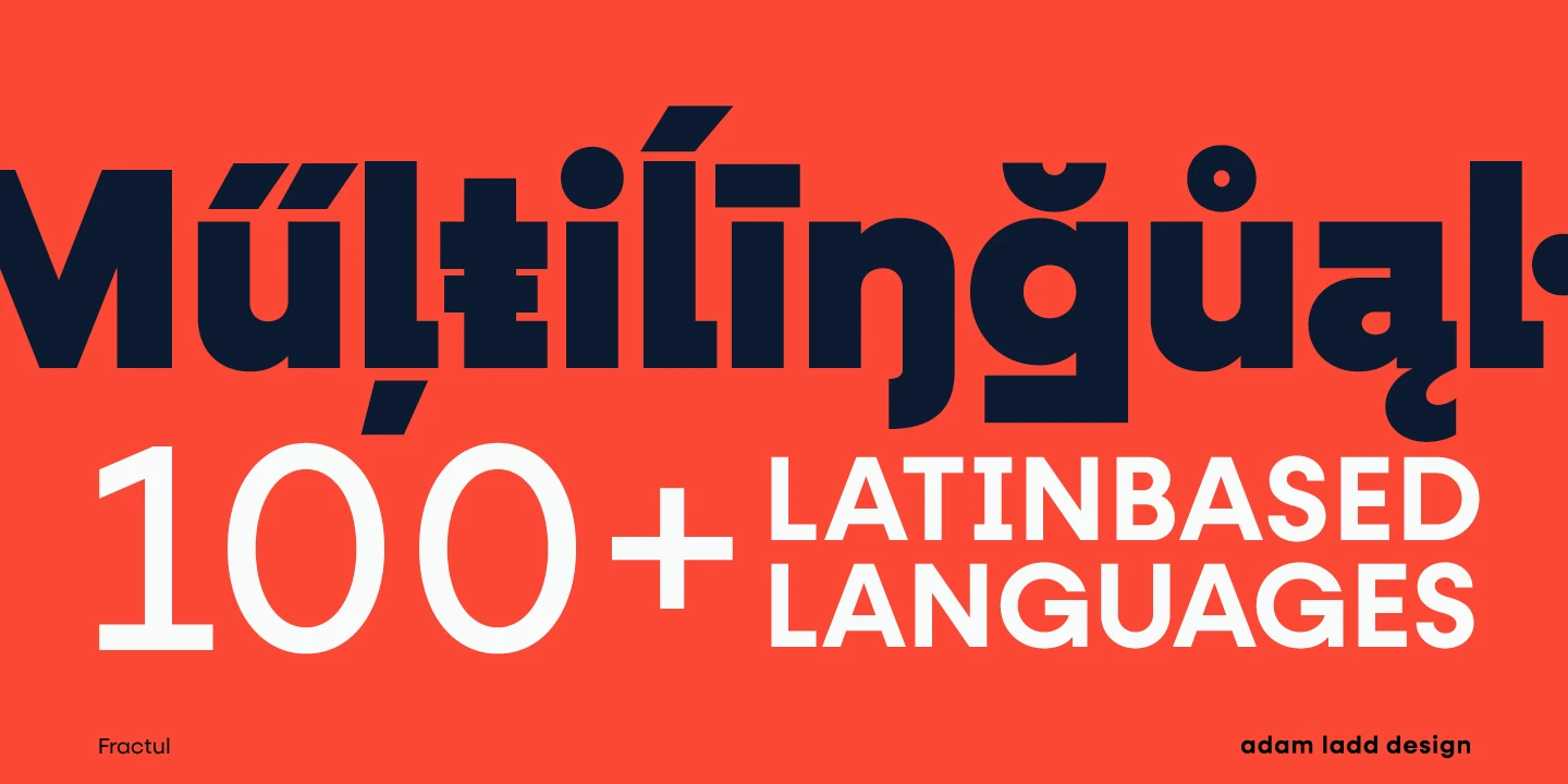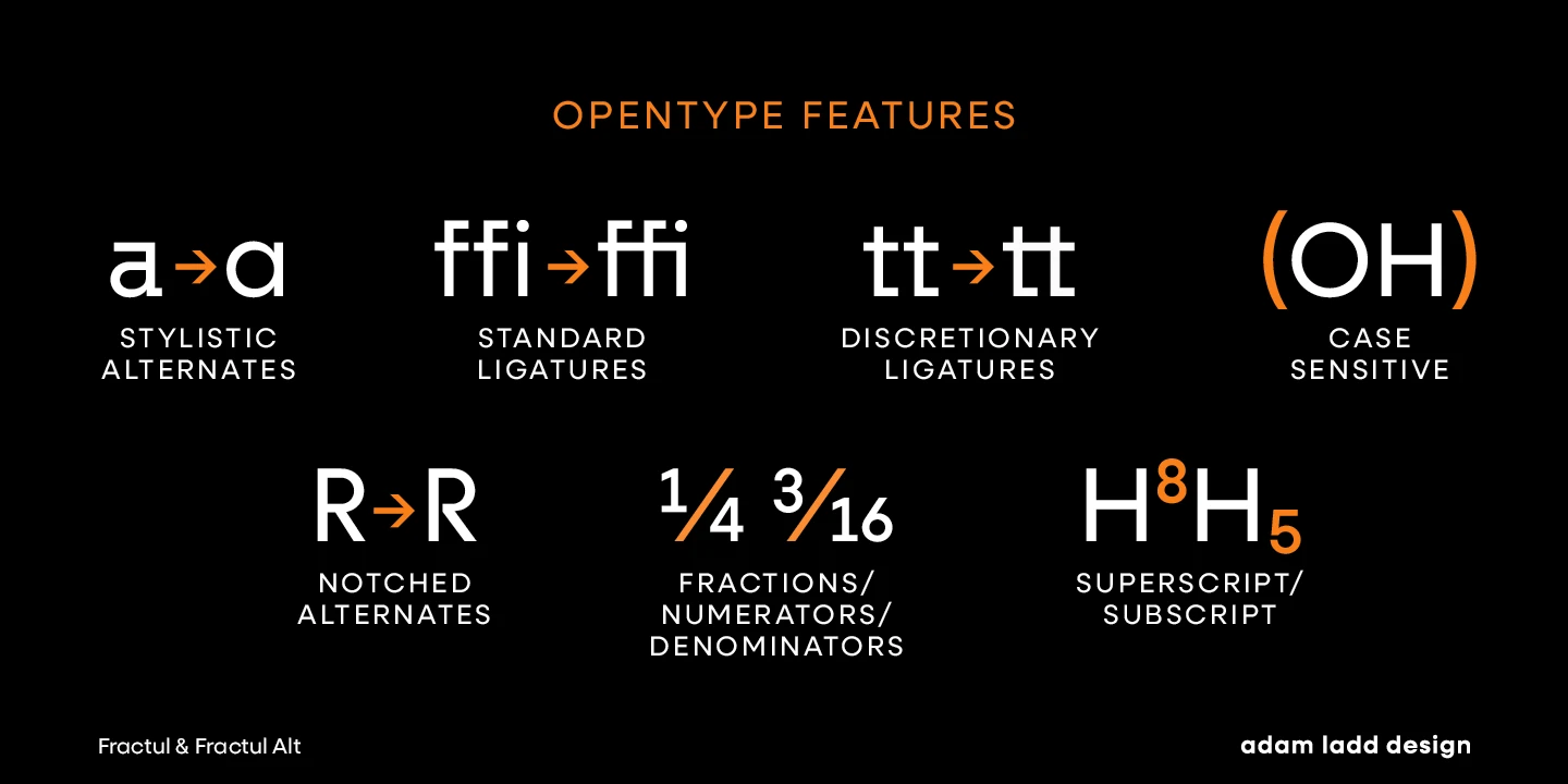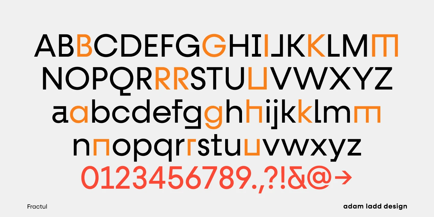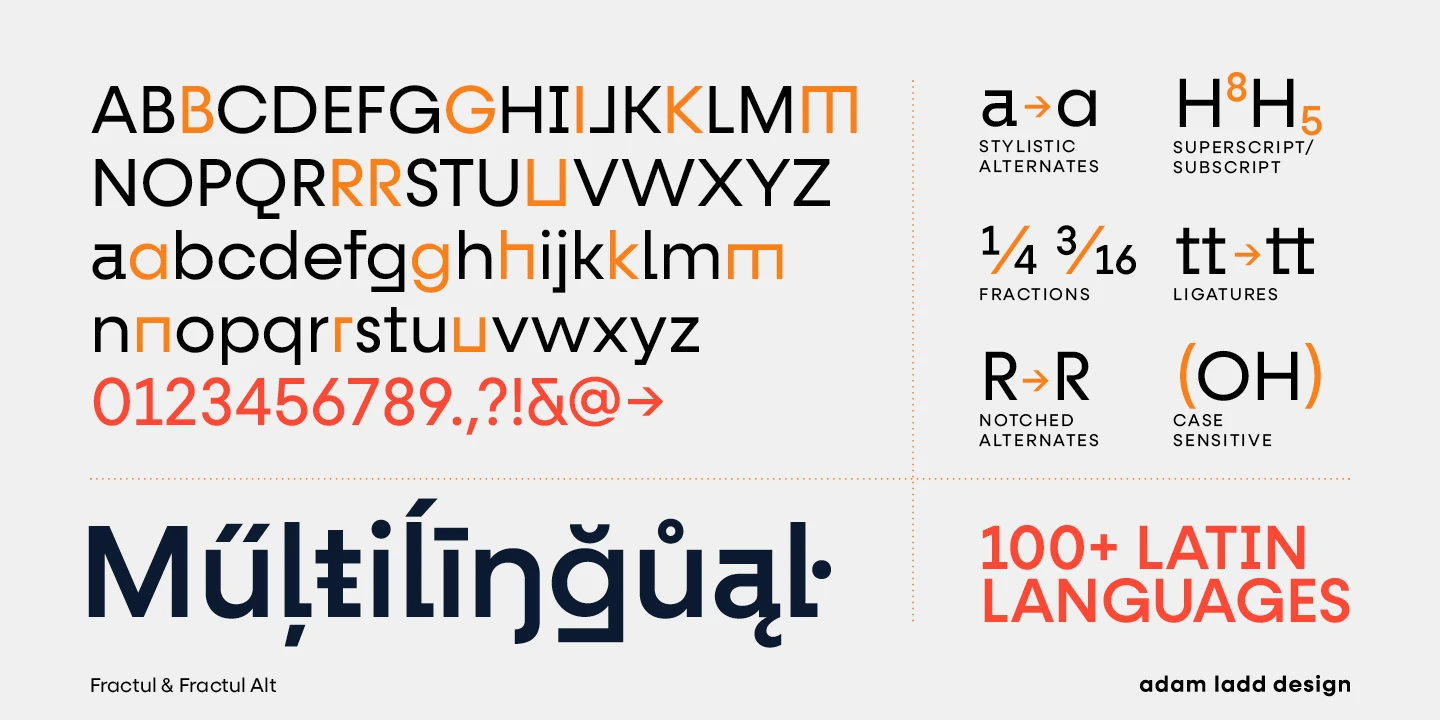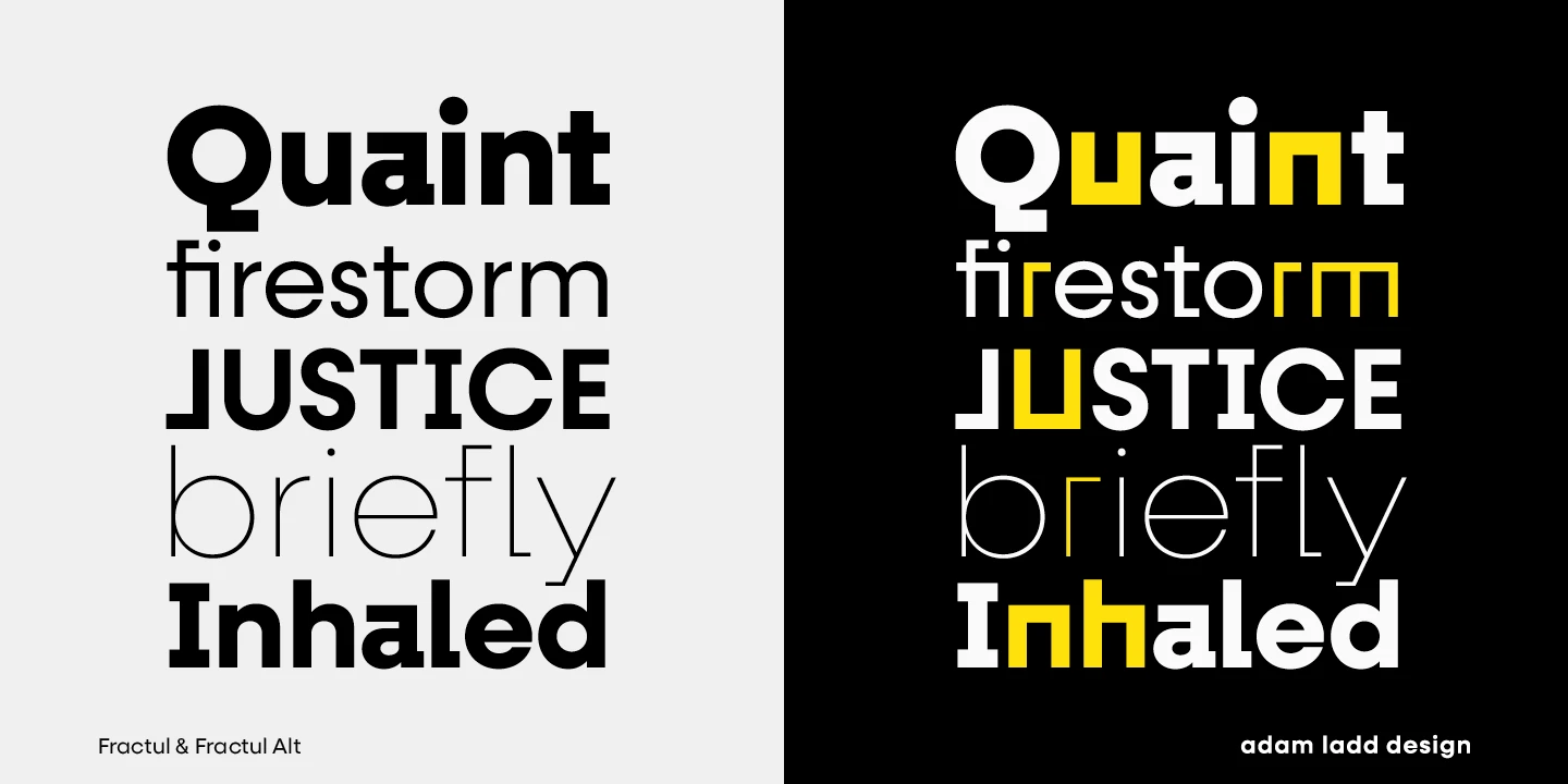 Fractul and Fractul Alt are architectural geometric sans serifs. Dramatically modern because of a larger x-height with a more distinct and avant-garde voice — most evident in characters where specific strokes have been straightened for a strong angular appearance. Fractul has over 600 glyphs and many OpenType features: 6 stylistic sets, standard and discretionary ligatures, case-sensitive punctuation, fractions, numerators, denominators, superscript, subscript, and even a slashed zero.