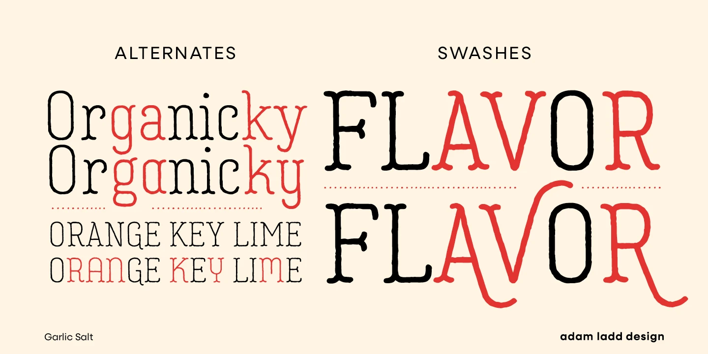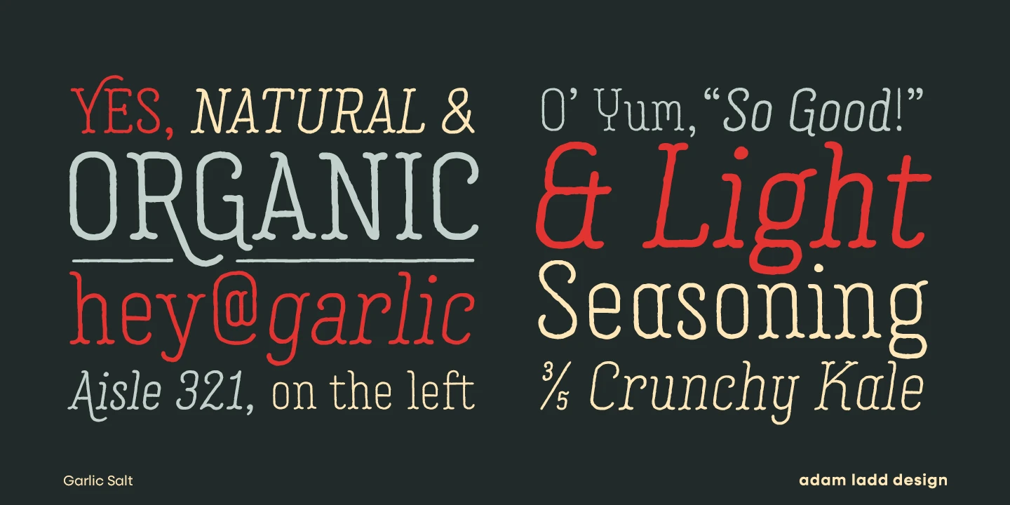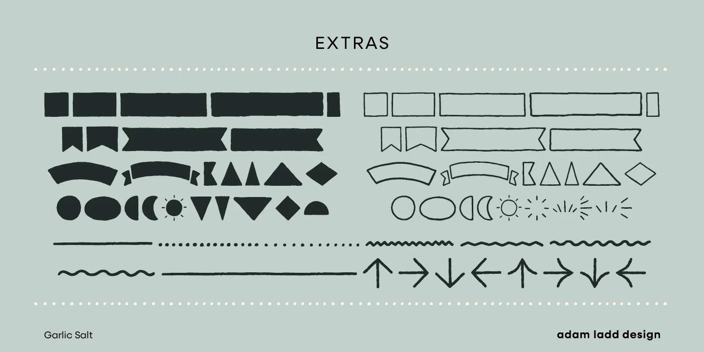 Garlic Salt is a flavorful, hand-drawn, serif font family with a distinctly monolinear mix of whimsical and modern. While semi-condensed proportions are space-saving for your designs, the large x-height and open counter forms mean it works well set large or small. Show off the texture at display sizes or use it smaller, and it remains pleasantly readable because of the carefully shaped letterforms. Garlic Salt also has an Extras font of matching ornaments and dingbats to complement your designs!