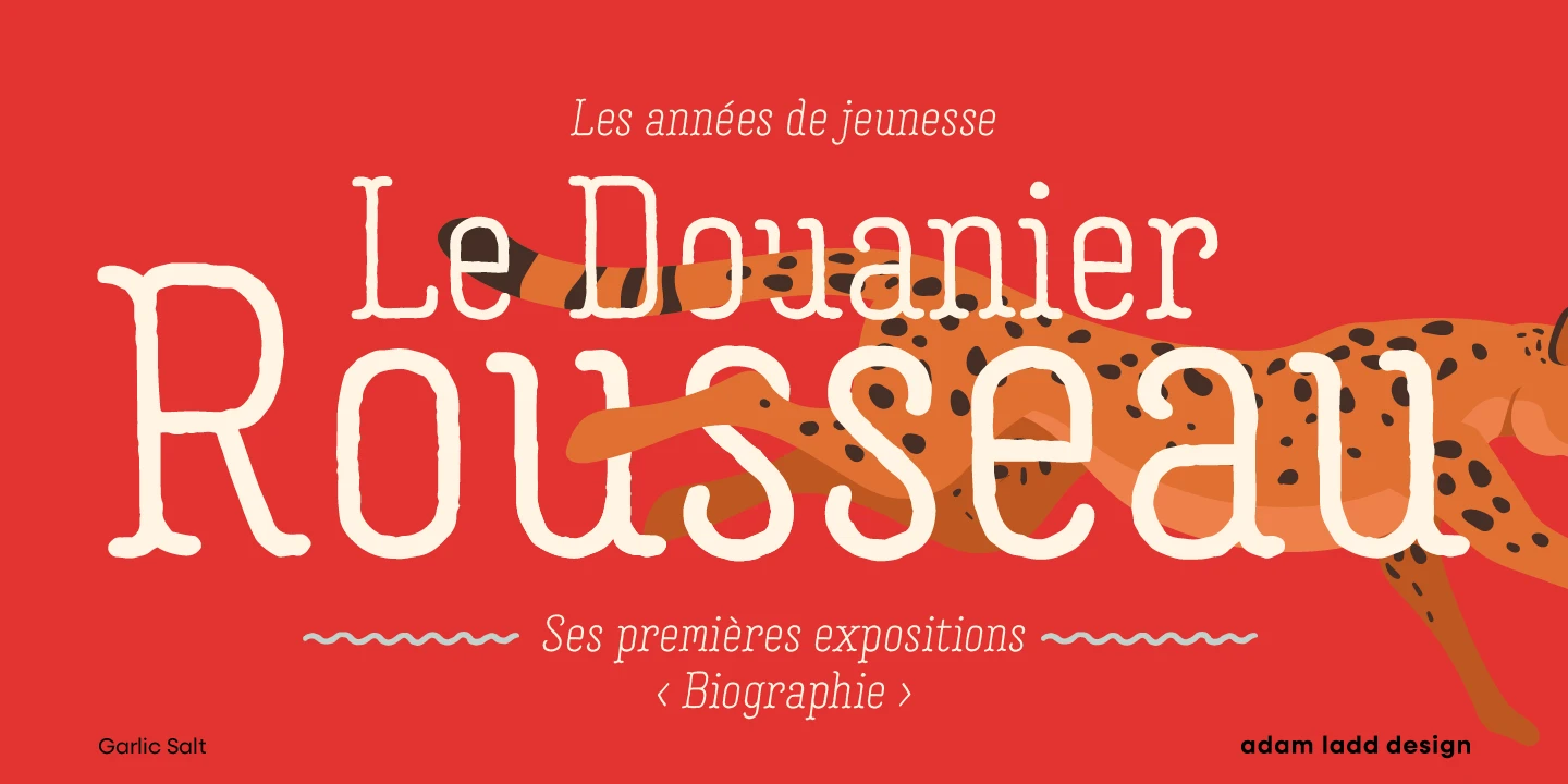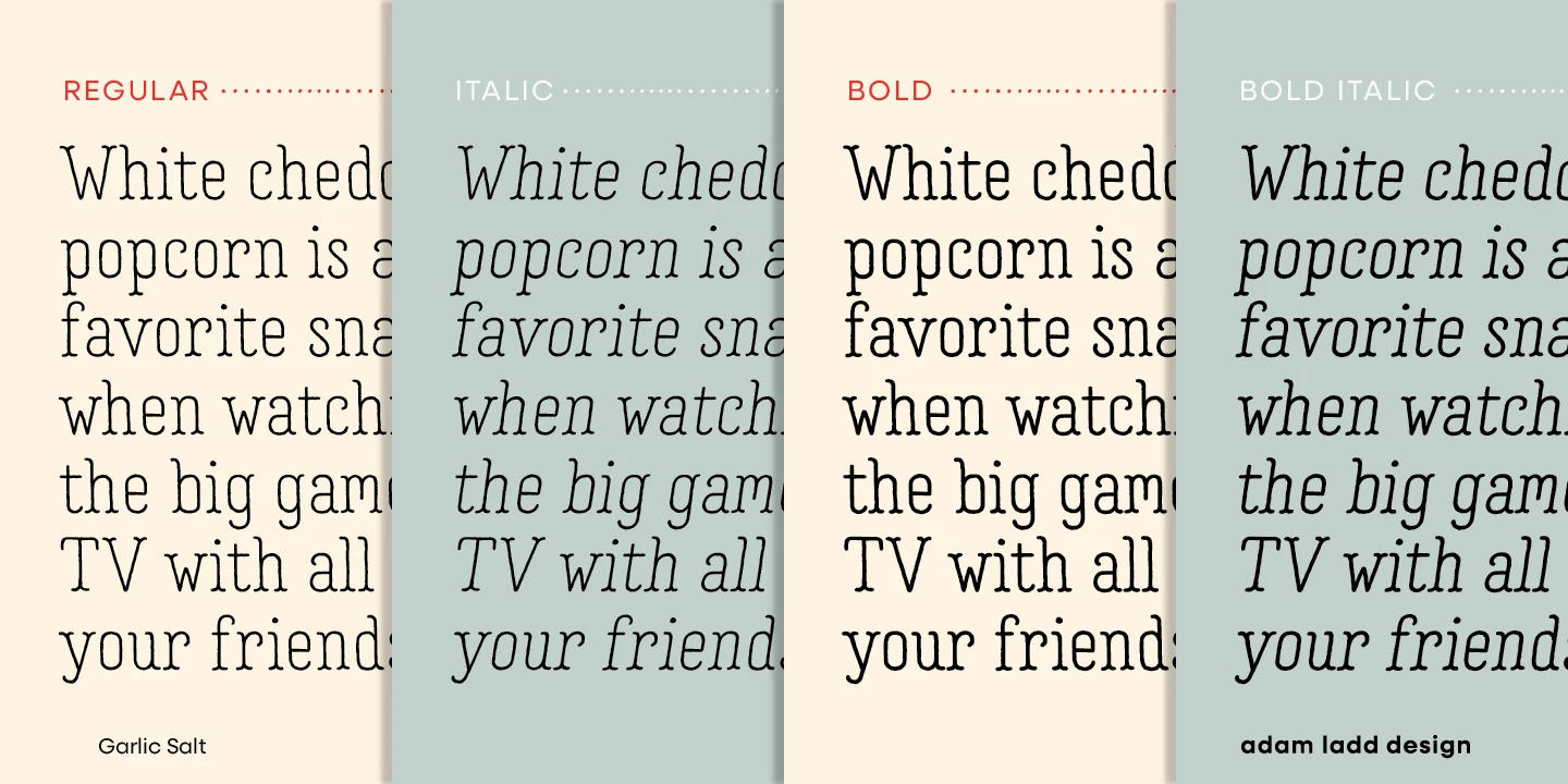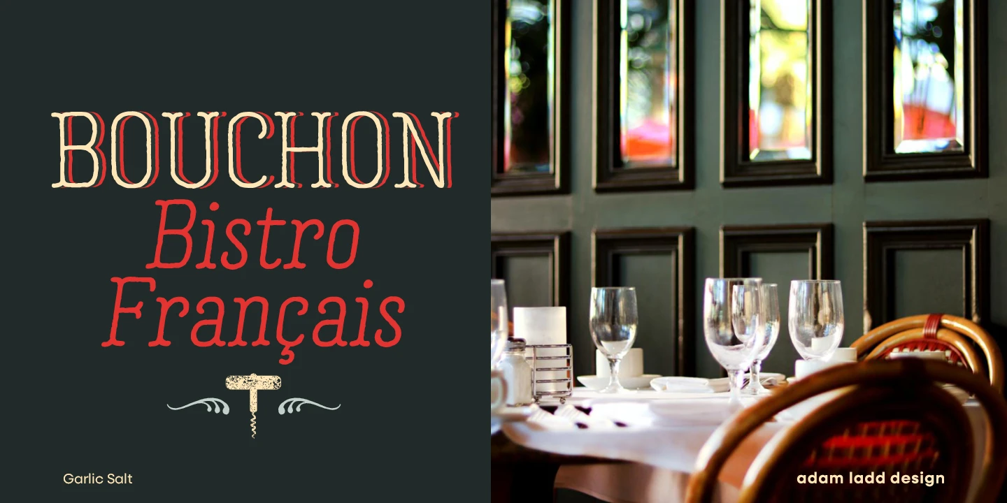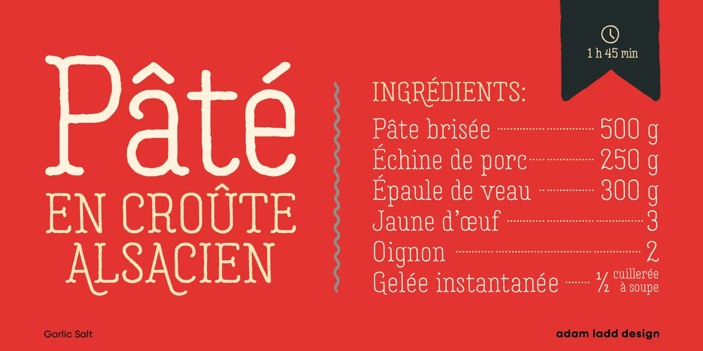 Garlic Salt is a flavorful, hand-drawn, serif font family with a distinctly monolinear mix of whimsical and modern. While semi-condensed proportions are space-saving for your designs, the large x-height and open counter forms mean it works well set large or small. Show off the texture at display sizes or use it smaller, and it remains pleasantly readable because of the carefully shaped letterforms. Garlic Salt also has an Extras font of matching ornaments and dingbats to complement your designs!