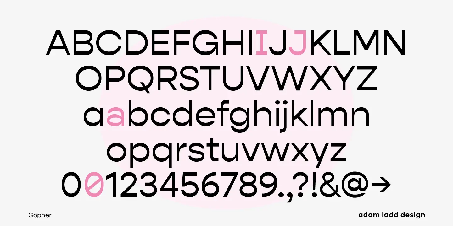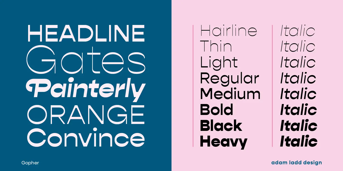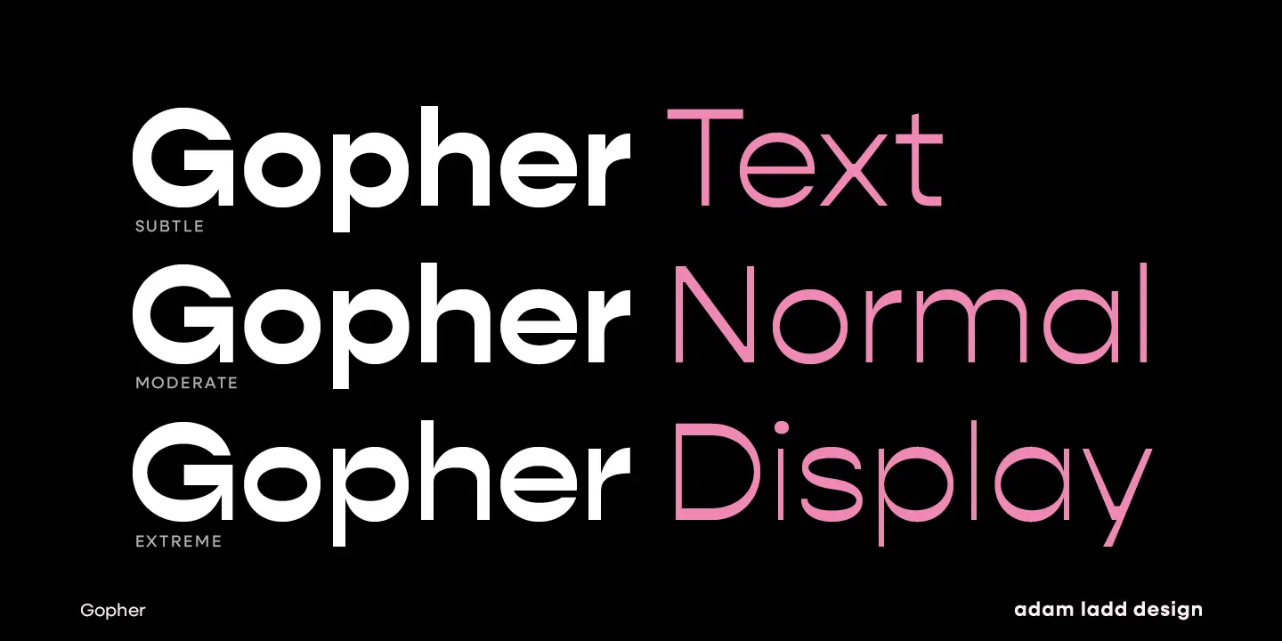 Gopher, Gopher Text, and Gopher Display comprise the families in this modernly quirky take on the reverse contrast, geometric sans. A variation in the amount of contrast distinguishes the three separate families while allowing them to work in harmony together. A generous range of dramatic affect adds to the versatility with Text having the most minor contrast and Display the most for immediate visual impact. The 48 included styles in the complete family range from hairline to heavy and italics.