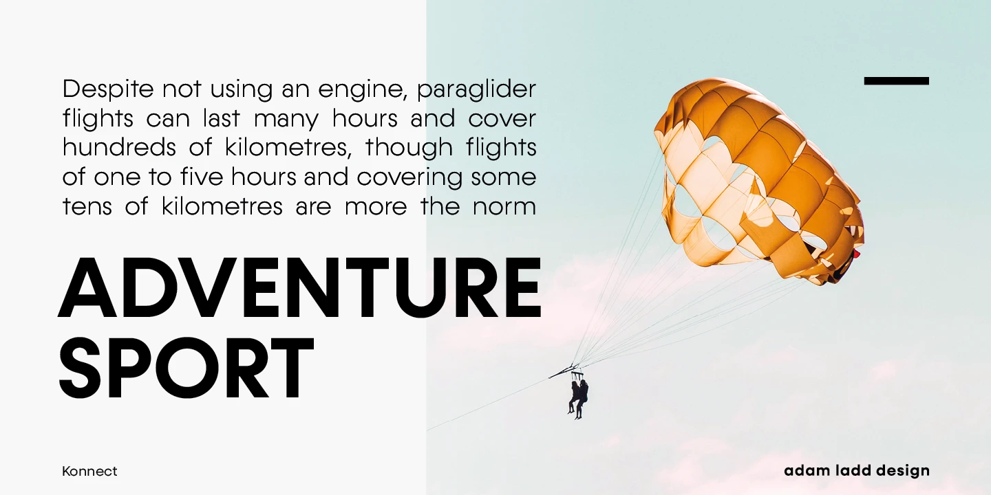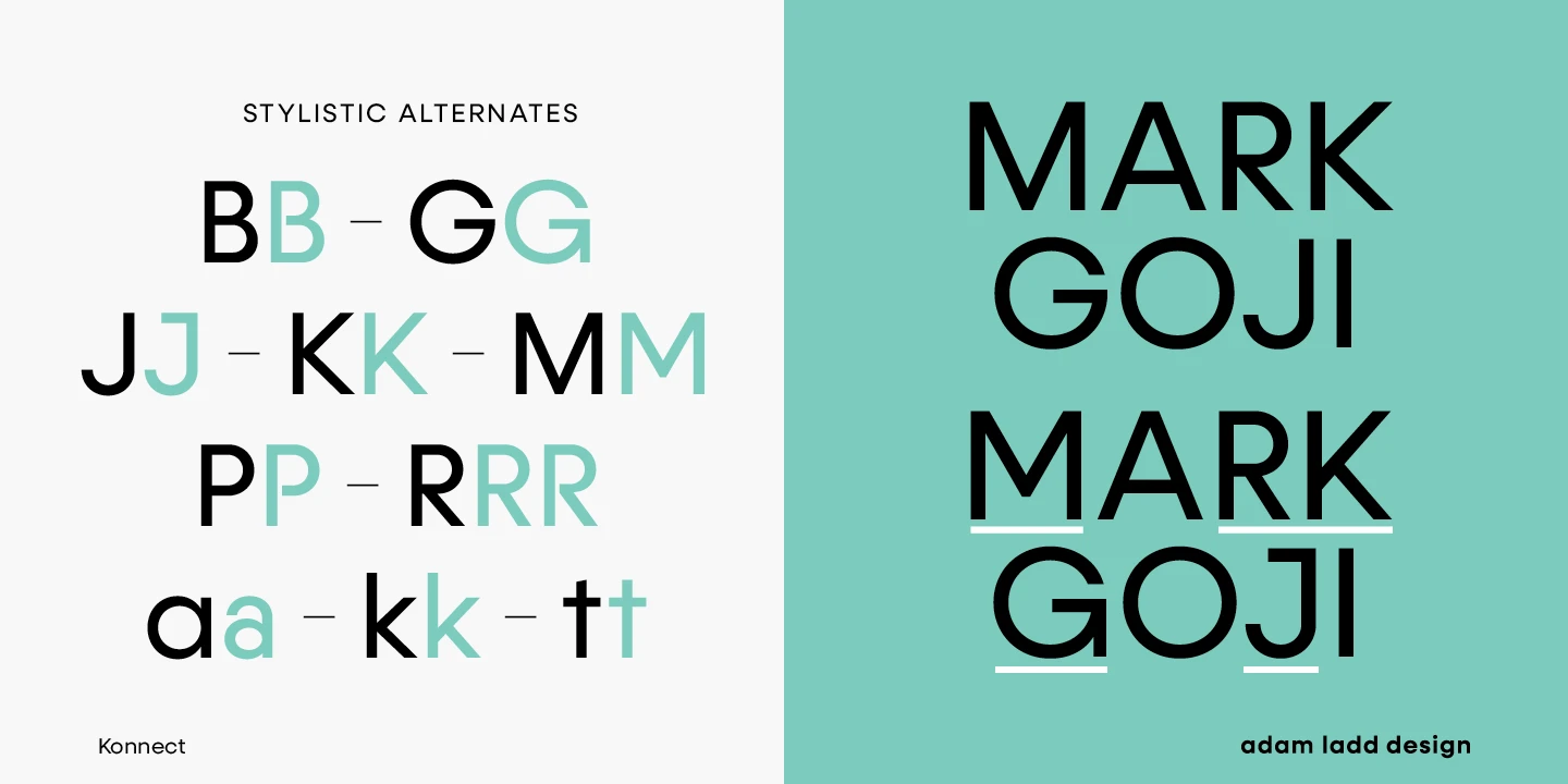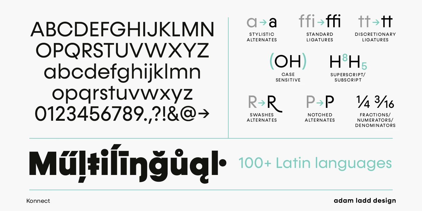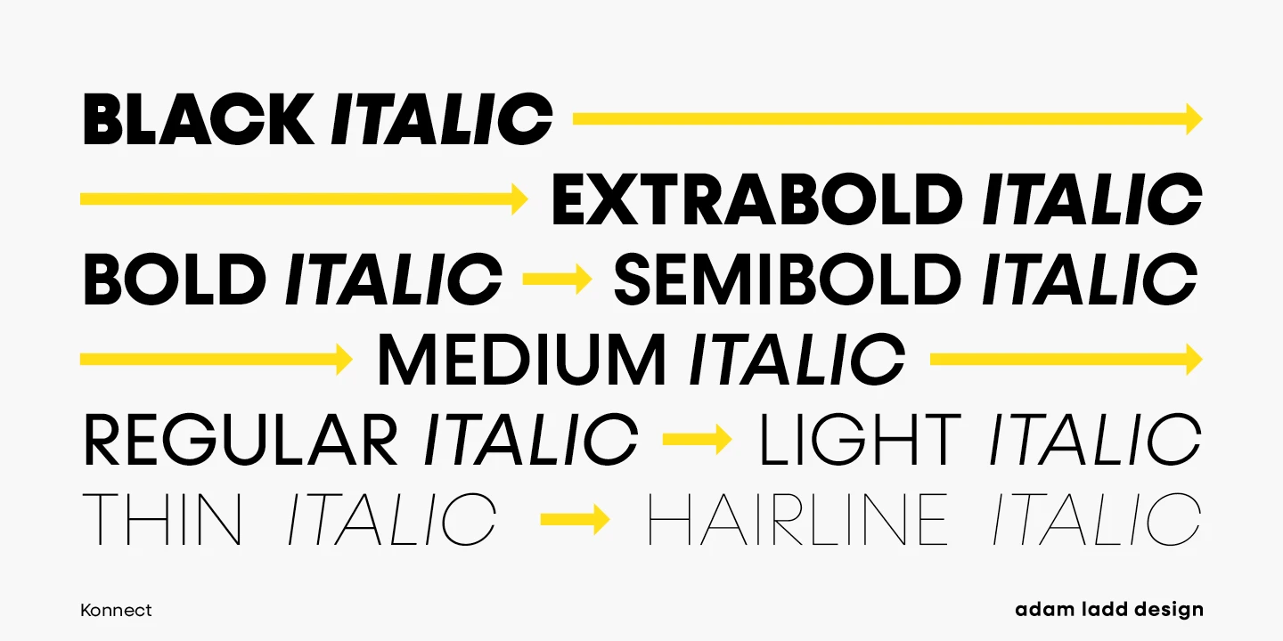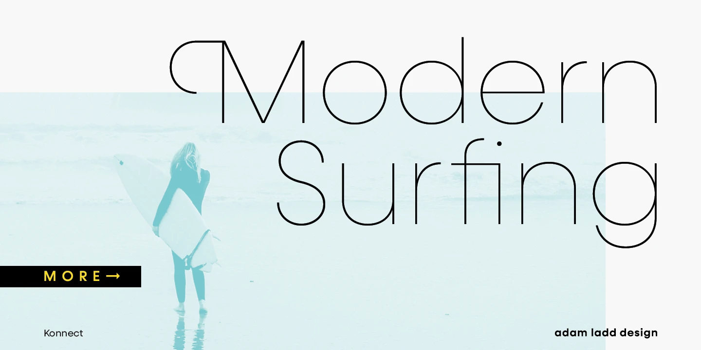 Konnect is an entirely modern geometric sans made for dramatic statements. While the simple, clean forms and proportions are timeless, the large x-height, closed apertures, and horizontal/vertical terminals provide a more distinct take on this genre, quite noticeable in display settings. This family includes a robust range of weights, from a delicate Hairline to a hefty Black, each with italics. Konnect is ideal for branding, advertising, logos, magazines, headlines, posters, and more!