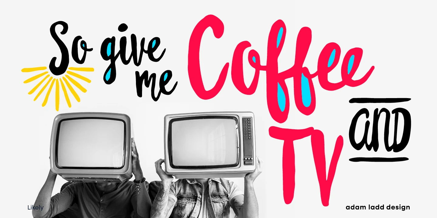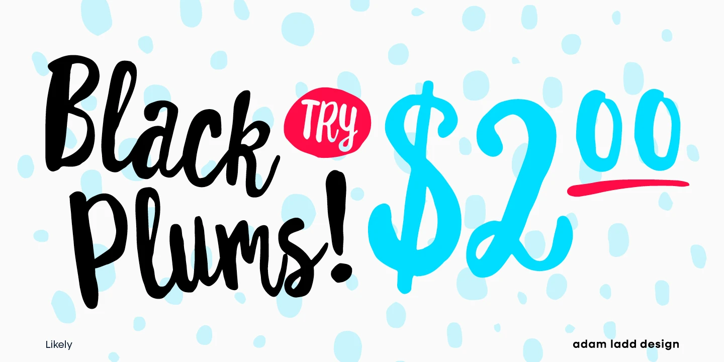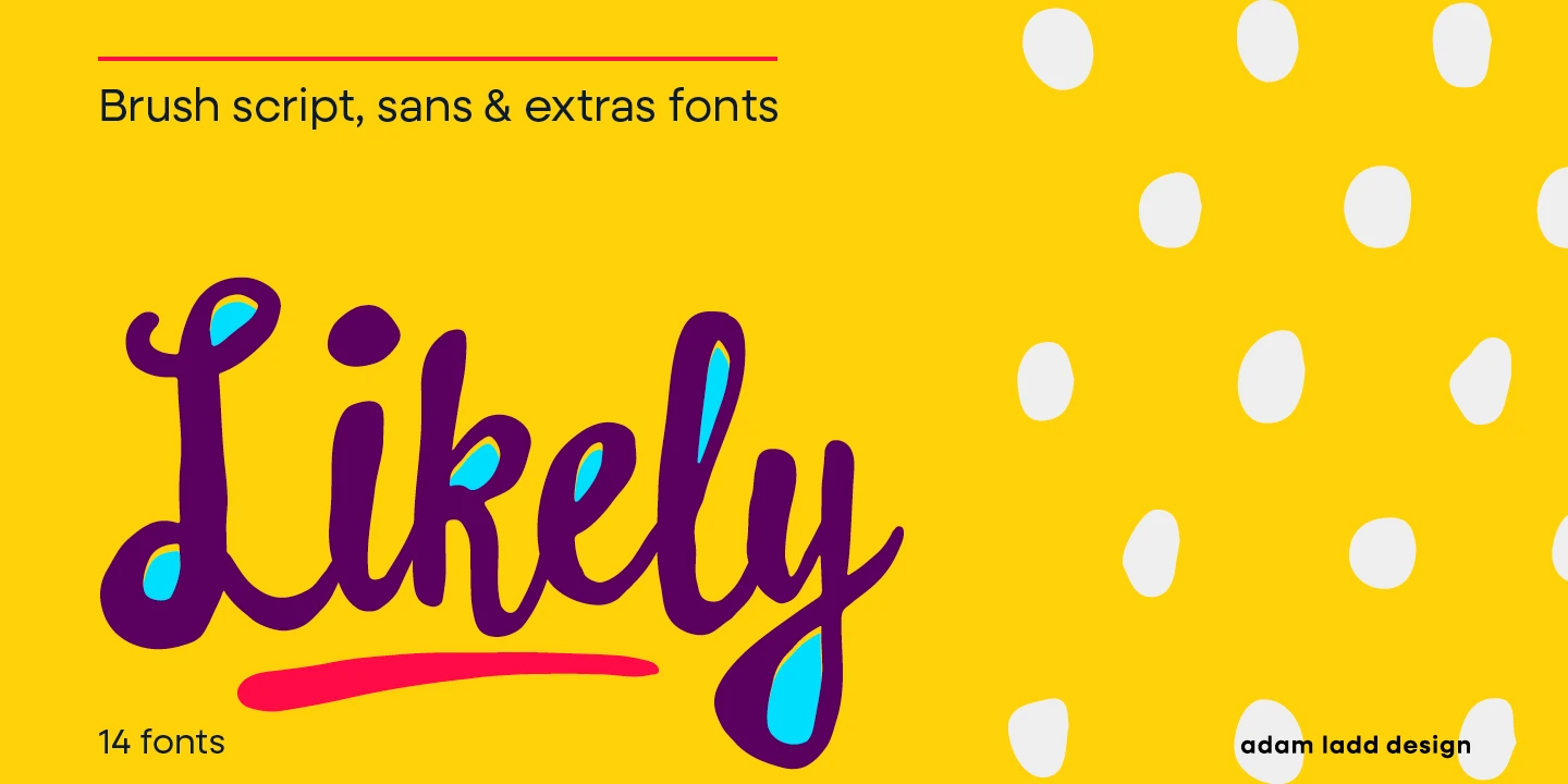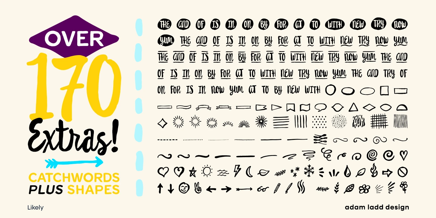 Likely is a joyful brush script family that pairs nicely with Likely Sans, a hand-lettered sans. These typefaces are designed to work together as a naturally vibrant package. Colorize Likely Counter to add playful dimension to book jackets; explore Likely Catchwords to add appeal to your magazine covers; or create patterns and borders for invitations and newsletters using Likely Shapes. There are also ligatures, alternates, and swashes for certain characters to add playful flair to your work.