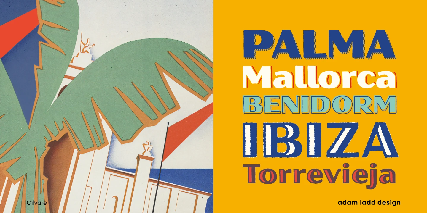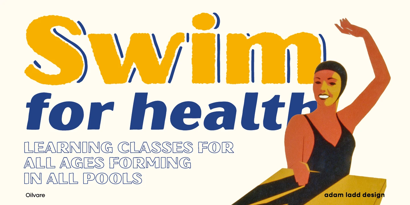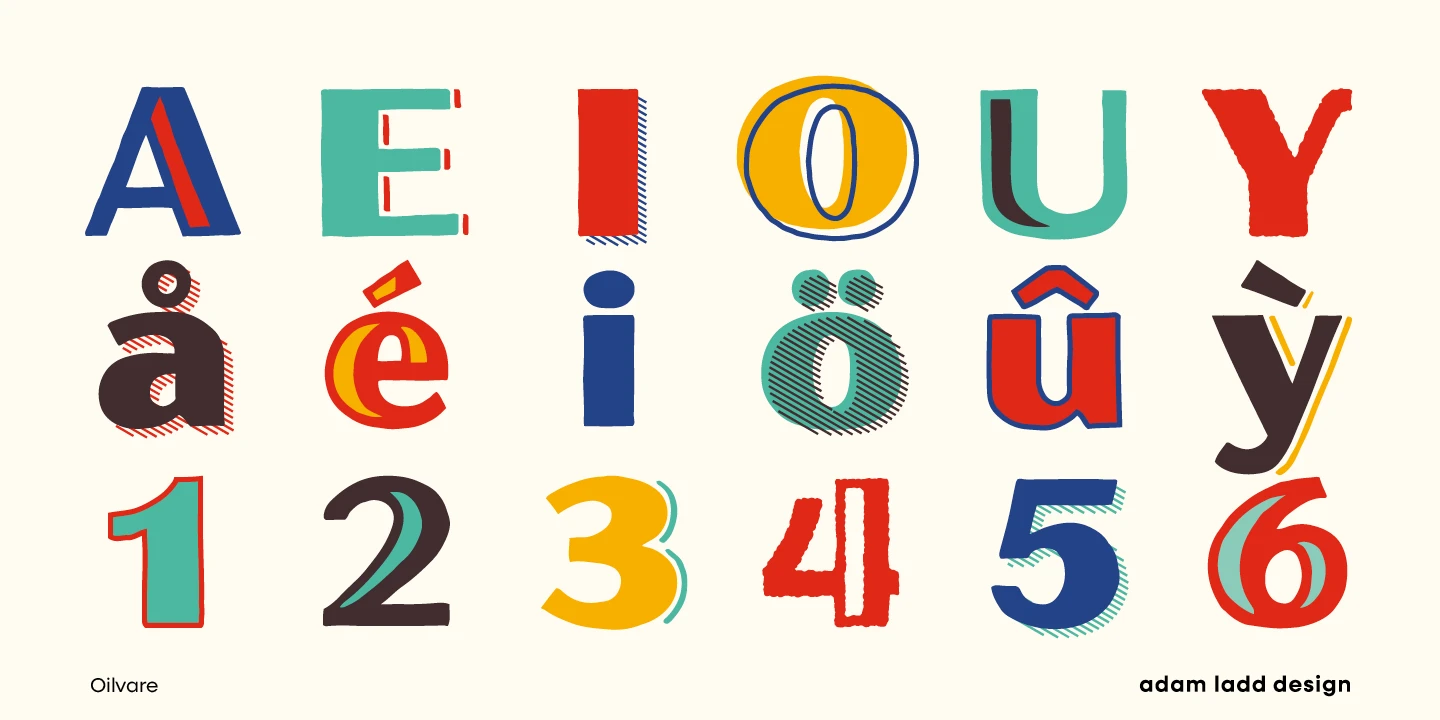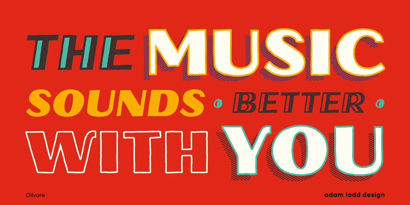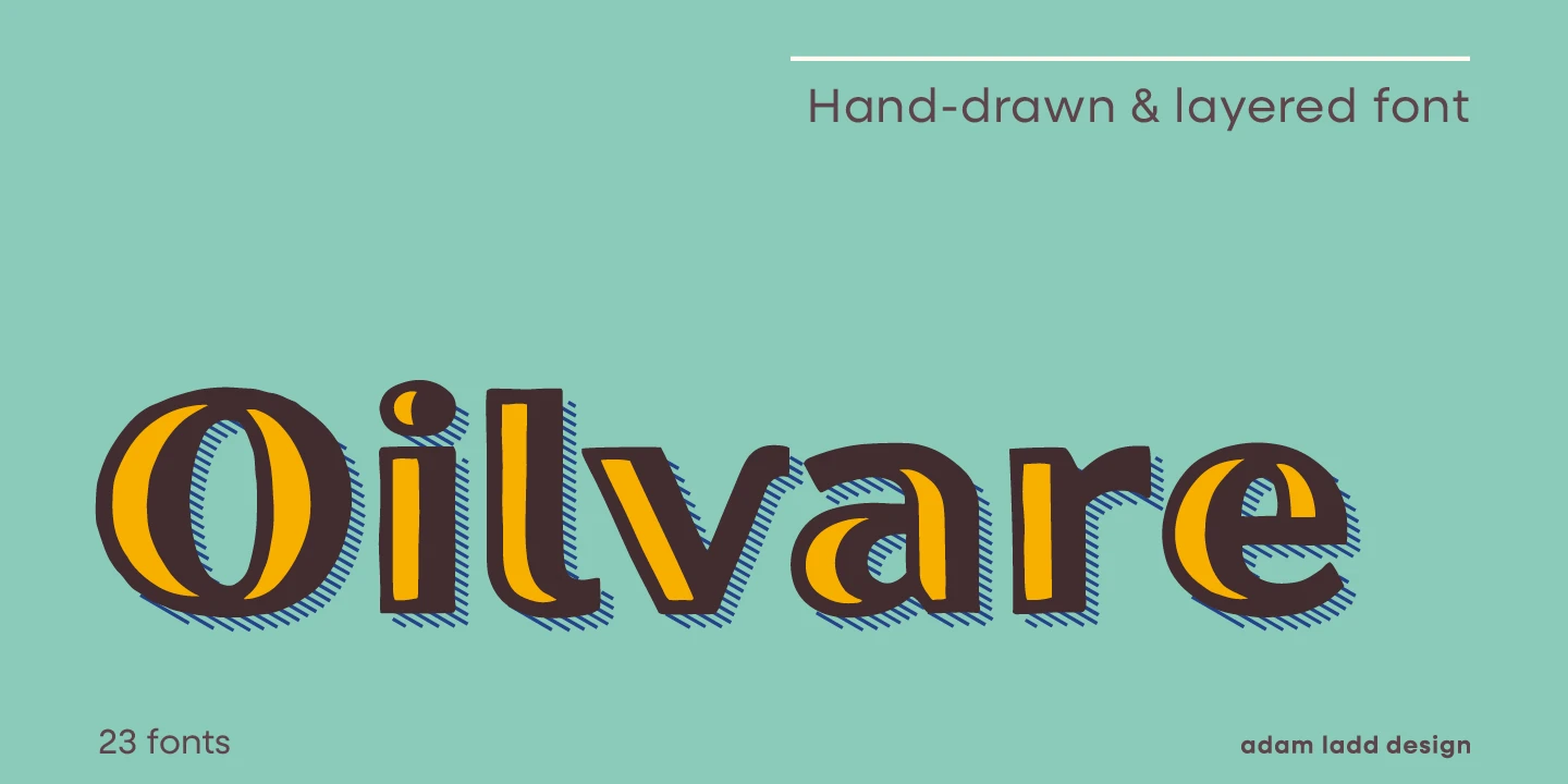 Oilvare is a hand-drawn, layered family inspired by vintage painted signs and oil cans. While sturdy, it has a softer side — wide proportions, oval-inspired forms, curled angle strokes, and a medium contrast all help distinguish it from the typical sans serif genre. Mix, match, and layer the styles to your aesthetic liking. The separate highlight and shadow options help the typeface come alive when colors are used with the solid styles — or choose the individual styles with already added details.