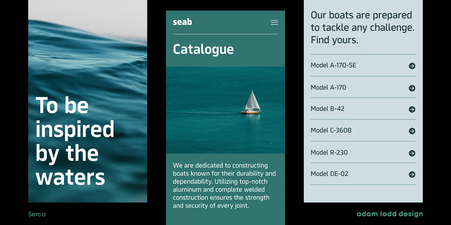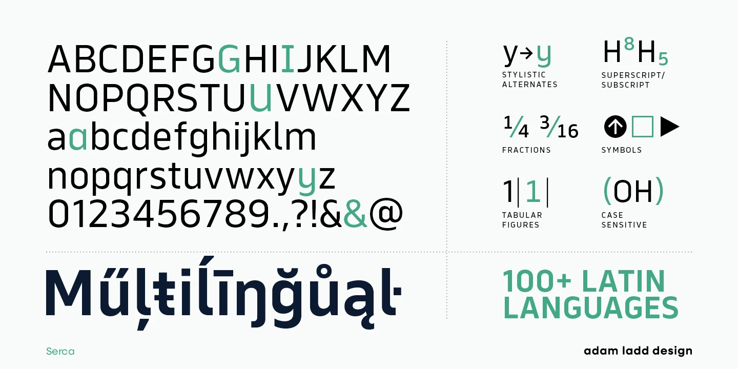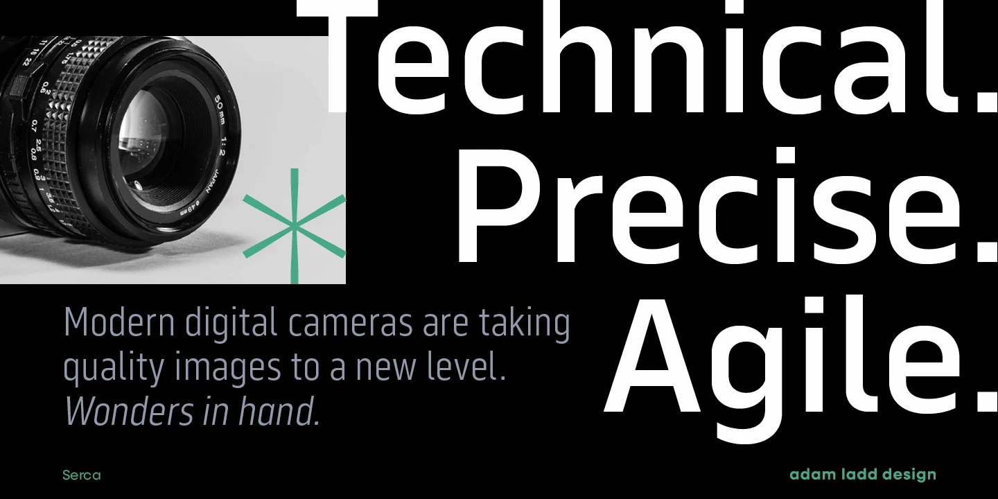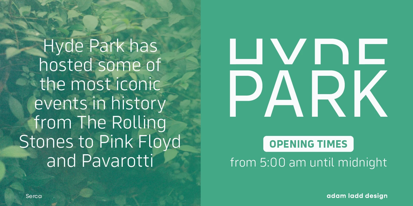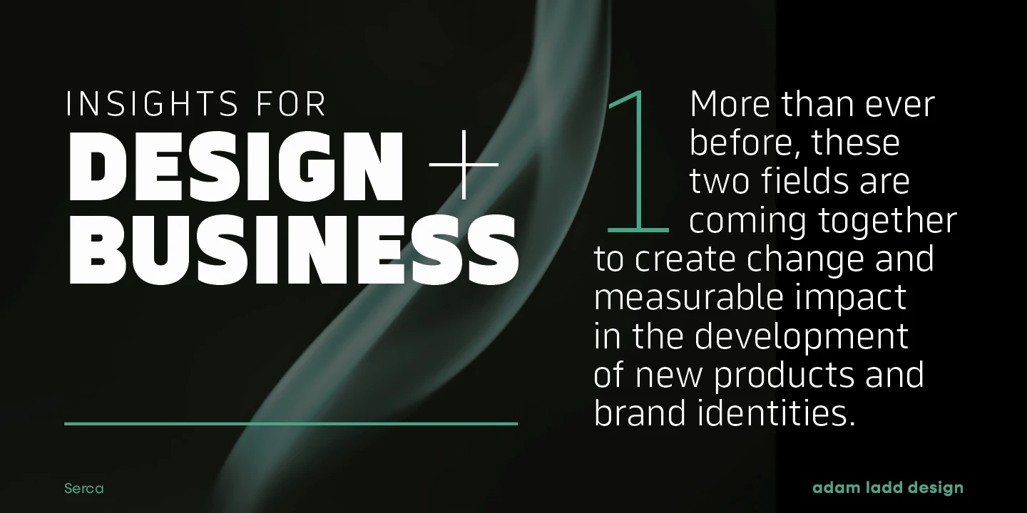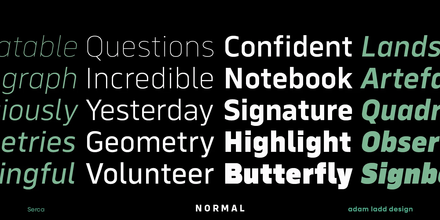 Serca and Serca Condensed are a grotesque sans family residing at the crossroads of business and design. It is precise without being cold and modern without being sterile. Because of the open counters and proportions, it can easily be used in both small text and large headlines. The well-considered typefaces lend themselves to brand systems, wayfinding plans, and marketing strategies. Combined, the families have 40 styles, including italics. The possibility for typographic variety is endless.