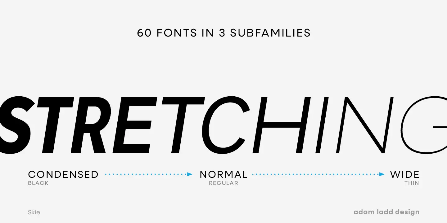 Skie is an inconspicuously alluring gothic sans standing apart from the crowd. Considered a superfamily, it’s a hidden gem full of branding, publishing, and marketing potential. The straightforward design achieves a neutral appearance, blending modern aesthetics with a hint of revived charm. The comprehensive Skie family has 60 fonts distributed and 10 weights per family: normal, condensed, and wide, including italics. Skie is the right choice to achieve your intended visual communication goals.