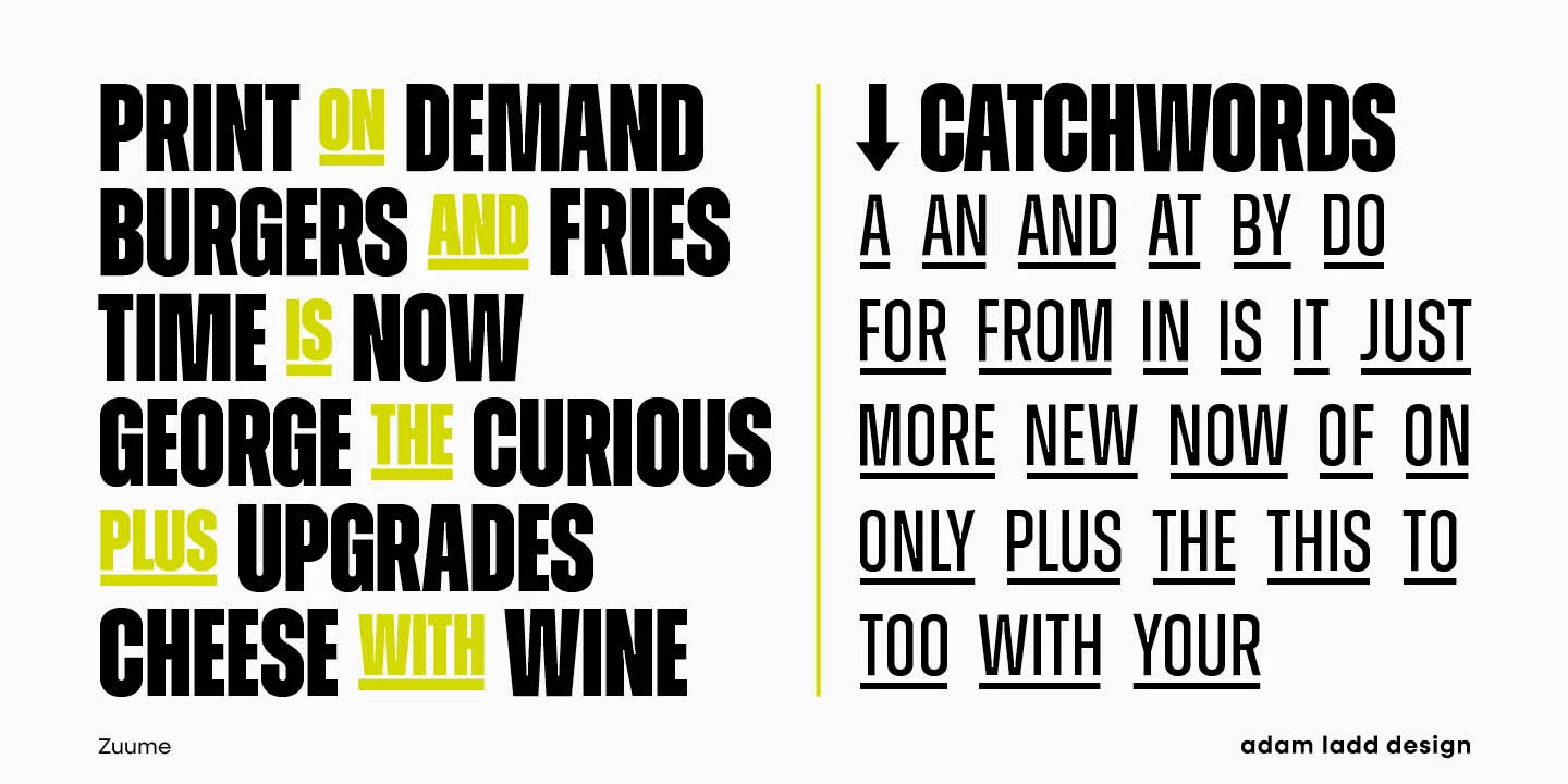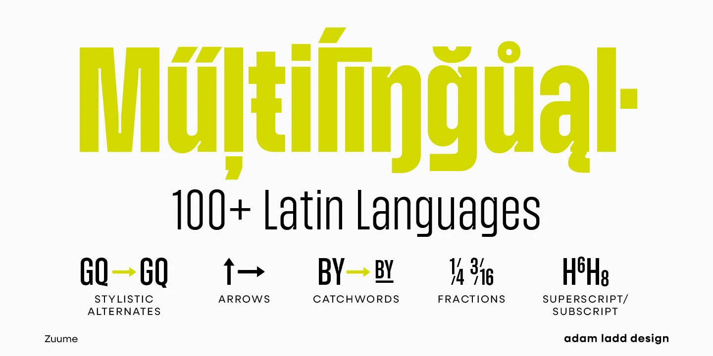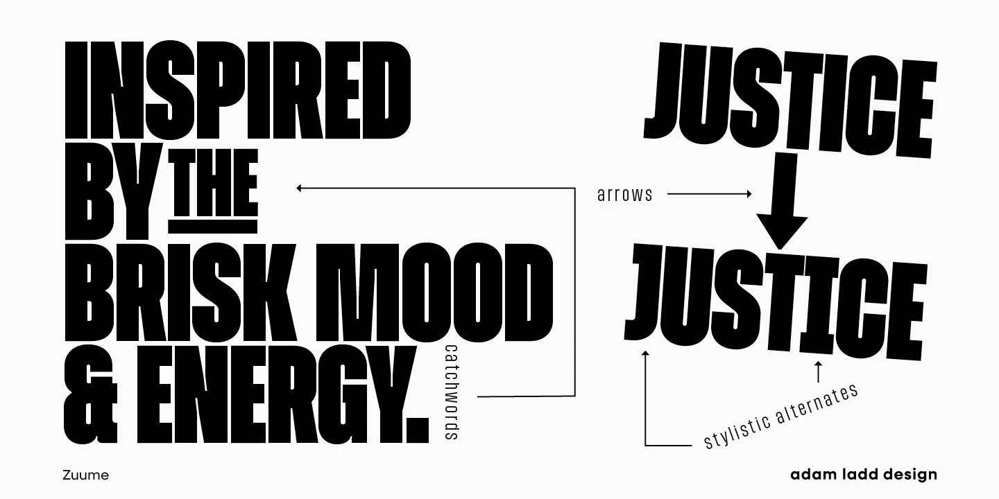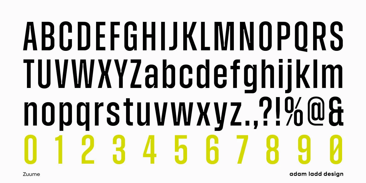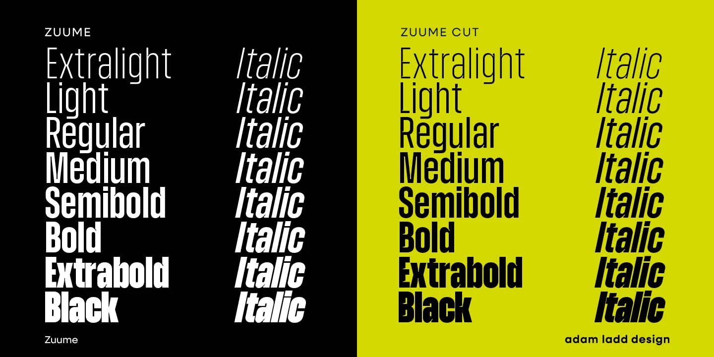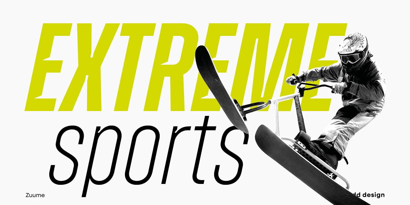 Zuume and Zuume Cut are certifiable look-at-me powerhouses. These typefaces are built to invigorate magazine headlines, media brands, fitness packaging, in-your-face entertainment, or anywhere else designers need maximum impact. The design has a sharp, technical feel that looks great, tightly spaced, and stacked for a visual punch. The sliced-out segments in Zuume Cut create more movement, aggression, and intentional speed. The robustly sturdy Zuume and Zuume Cut will leave an indelible mark!